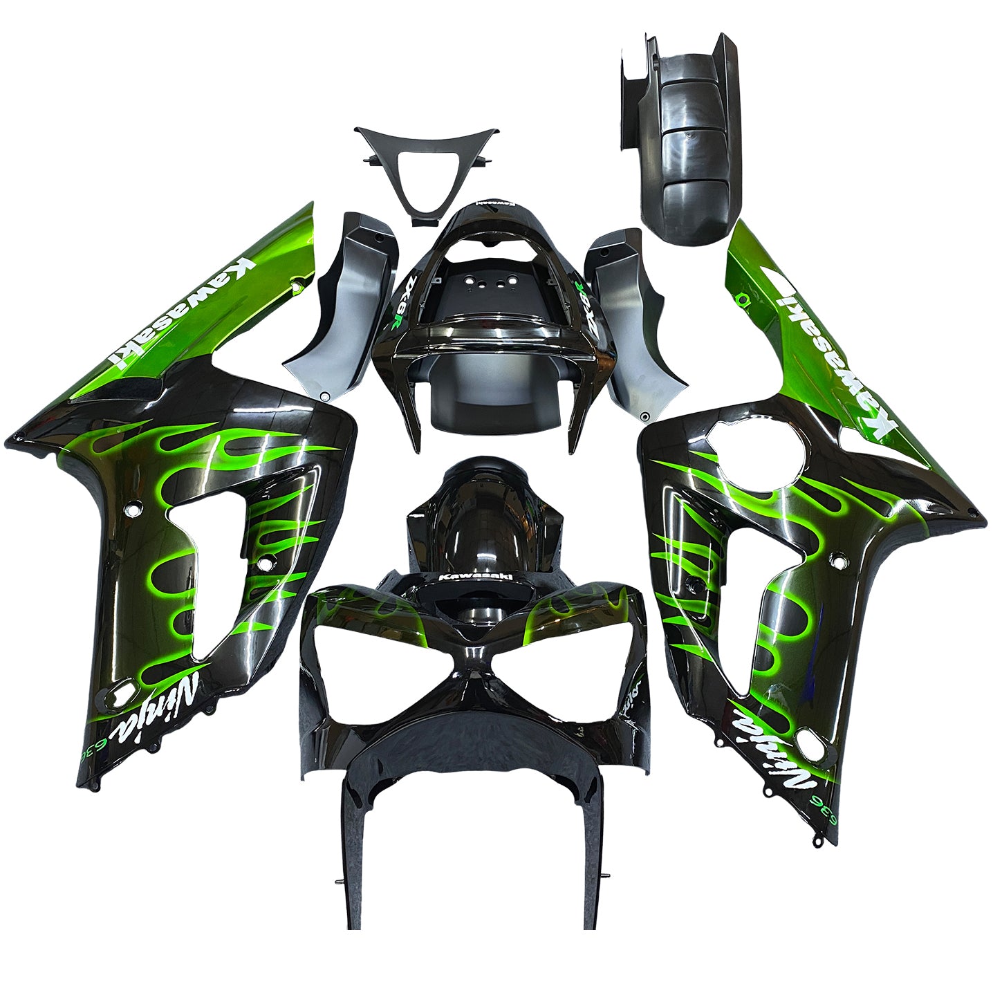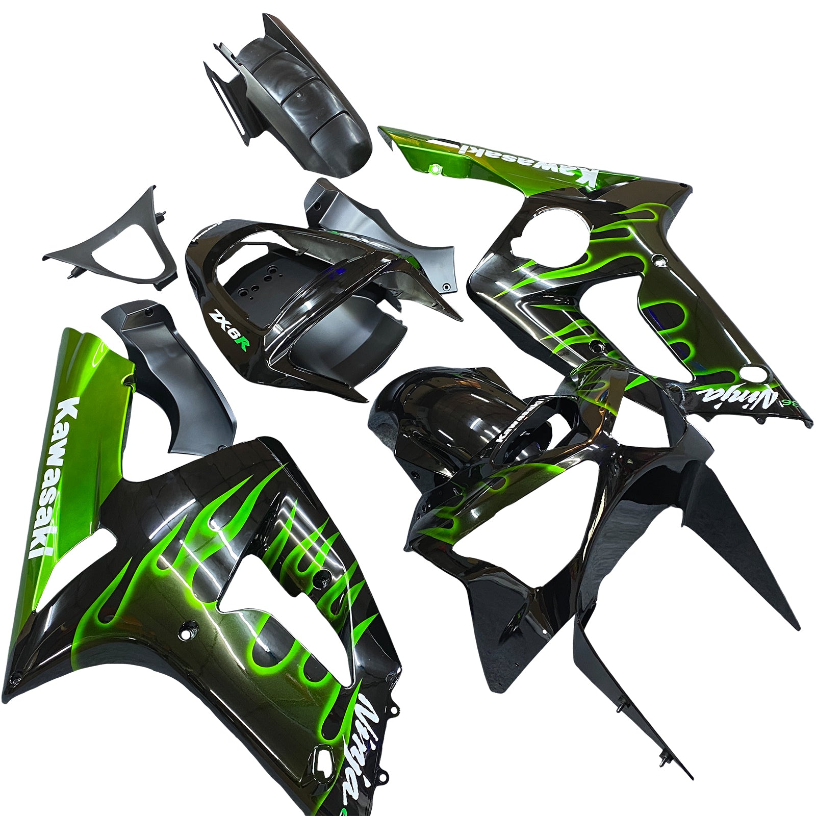 Amotopart 2003-2004 Kawasaki ZX6R Fairing Black&Green Flame Kit