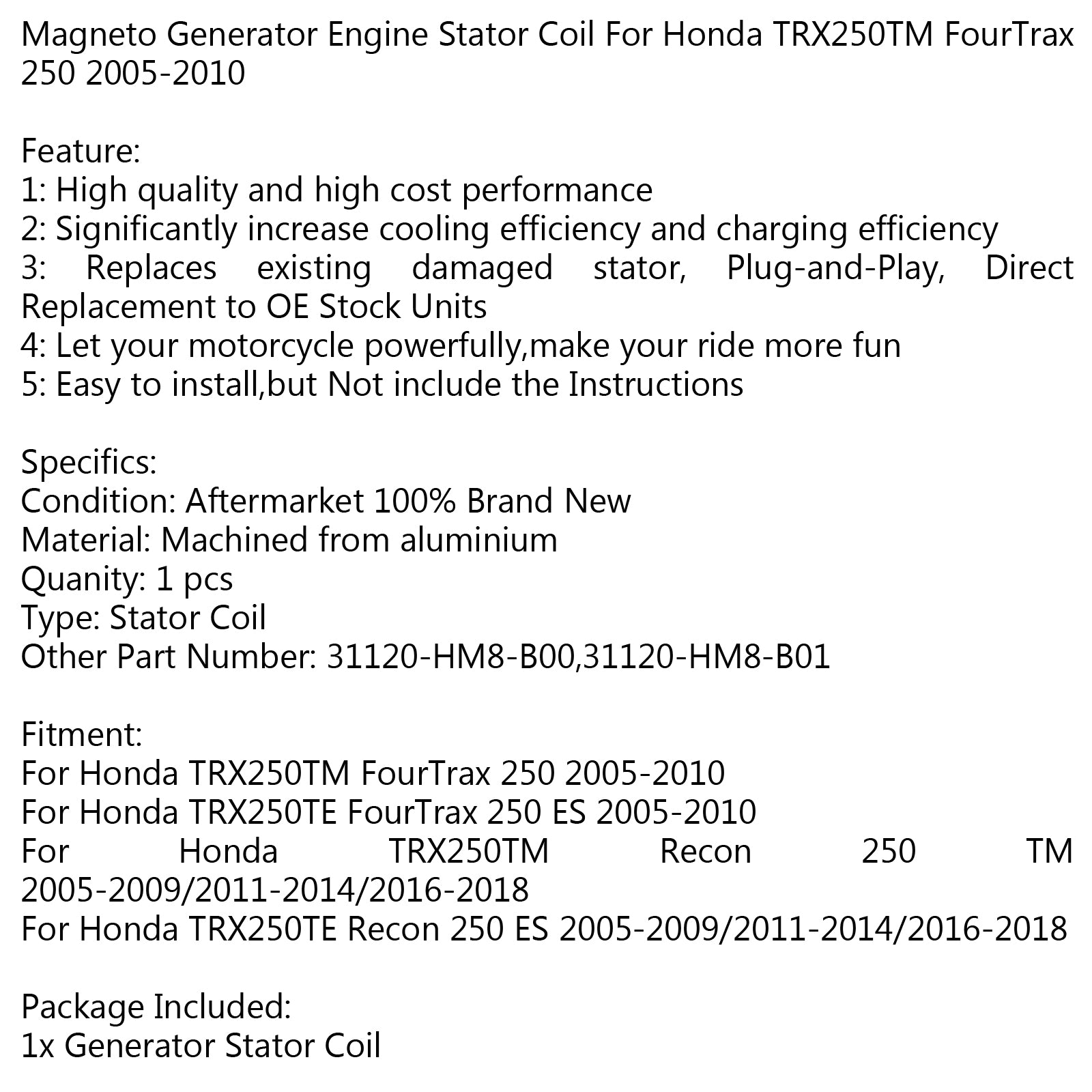 Generator Stator Coil For Honda TRX250TM Recon 250 TM 2005-2009/2011-14/2016-18