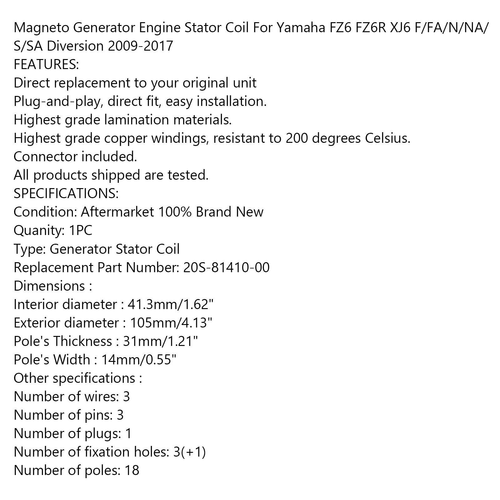 Generator Stator For Yamaha XJ6 XJ6F XJ6N XJ6S Diversion 09-17 20S-81410-00