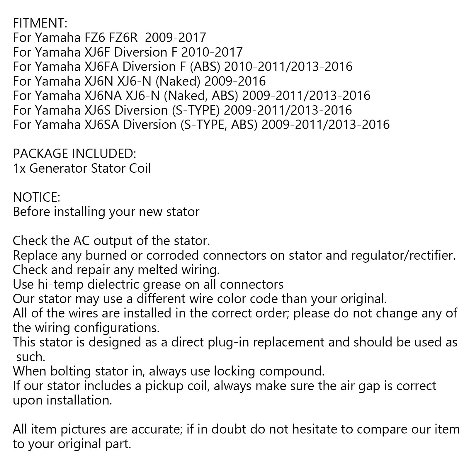 This stator is designed as a direct plug-in replacement and should be used as such.