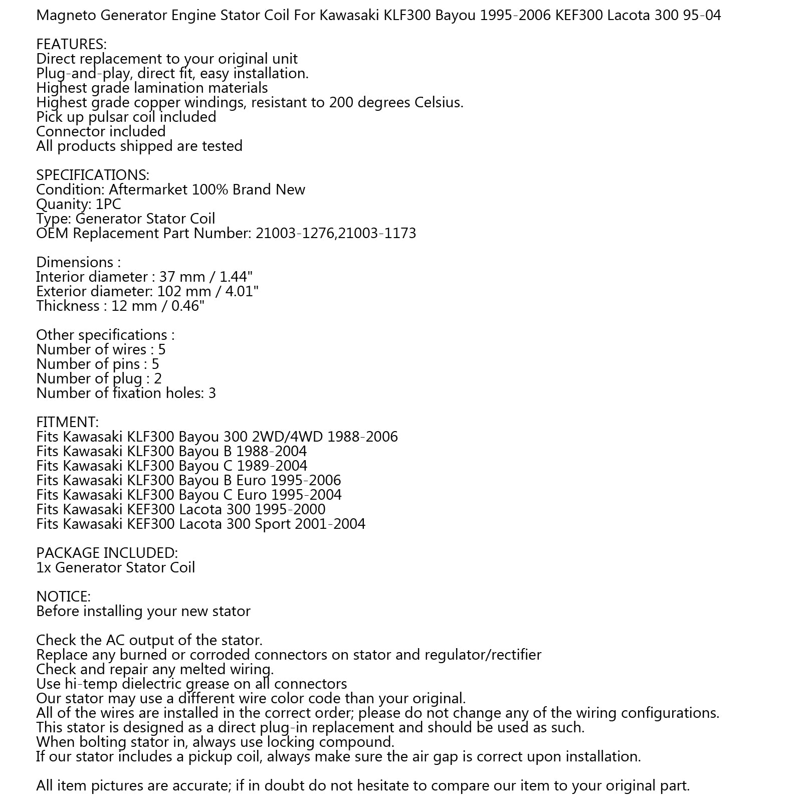Kawasaki KLF300 Euro 2WD/4WD Magneto Generator Stator Coil 21003-1276 21003-1173
